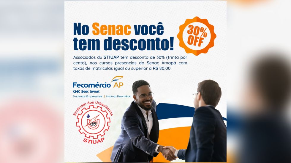 Associados do STIUAP tem desconto de 30% (trinta por cento), nos cursos presenciais do Senac Amapá com taxas de matrículas igual ou superior a R$ 80,00